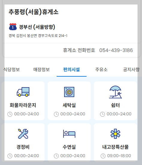 📌 참고: 한국도로공사 휴게소 안내에서 노선별 휴게소 시설과 차량관리 서비스를 확인할 수 있습니다.