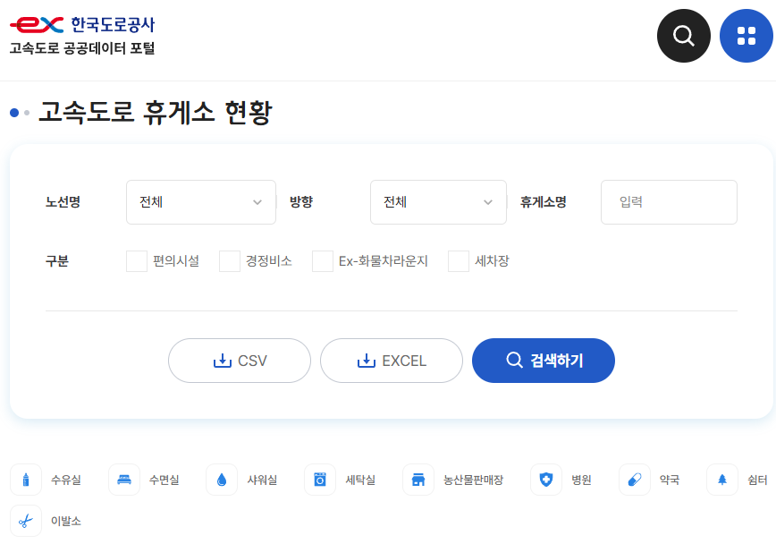 - 전국 휴게소 목록, 위치, 주요 편의공간, 매장별 운영시간을 다운로드 가능.