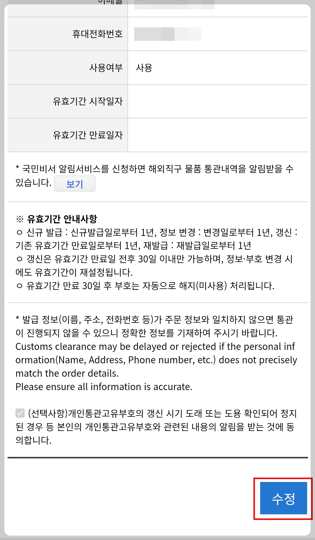 - 인증을 마치면 현재 사용 중인 본인의 개인통관고유부호가 화면에 나타납니다.