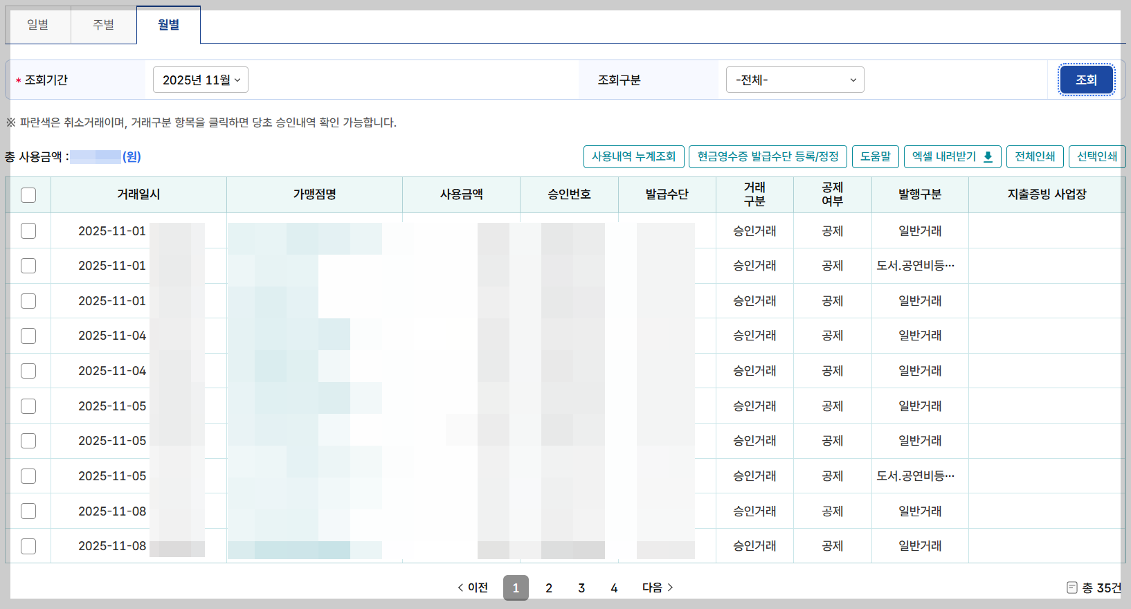 3) 사용내역 조회: '사용내역(소득공제) 조회' 또는 '사용내역(지출증빙) 조회' 탭을 선택합니다. 일별, 주별, 월별 등 기간을 설정하여 원하는 기간의 현금영수증 발급 내역을 상세하게 확인할 수 있습니다. 거래일시, 가맹점 정보, 사용 금액 등이 모두 표시되어 꼼꼼한 지출 관리가 가능합니다.