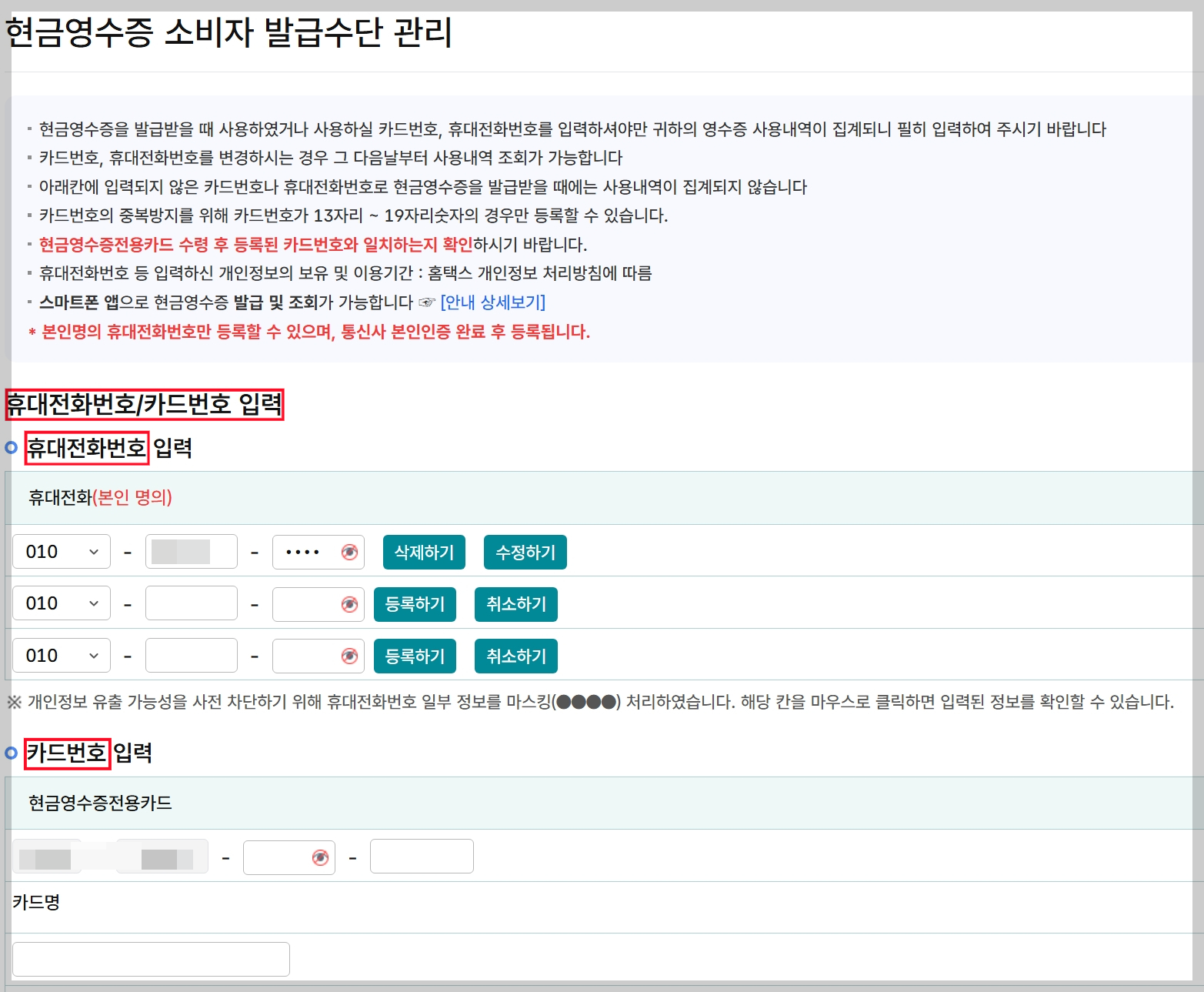 카드번호 입력: 현금영수증 기능이 있는 체크카드, 신용카드, 멤버십 카드 등의 번호를 추가로 등록할 수 있습니다. 이렇게 카드를 등록해 두면, 현금 결제 시 해당 카드를 제시하는 것만으로도 현금영수증이 자동으로 발급됩니다.