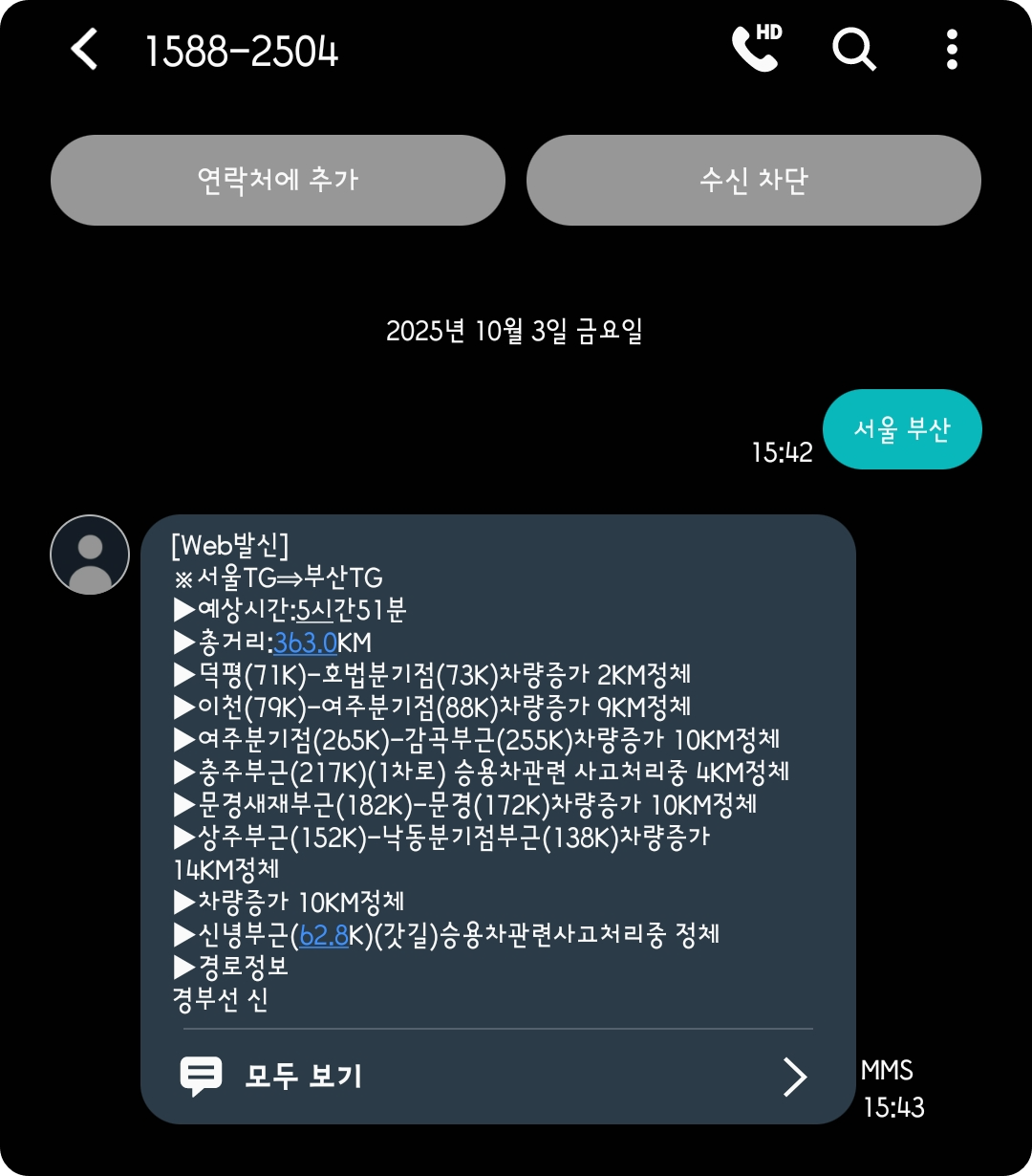 - 신청 방법: 문자메시지에서 번호 입력 후 가고자 하는 출발지와 도착지 입력 → 사고·정체 발생 시 문자로 수신