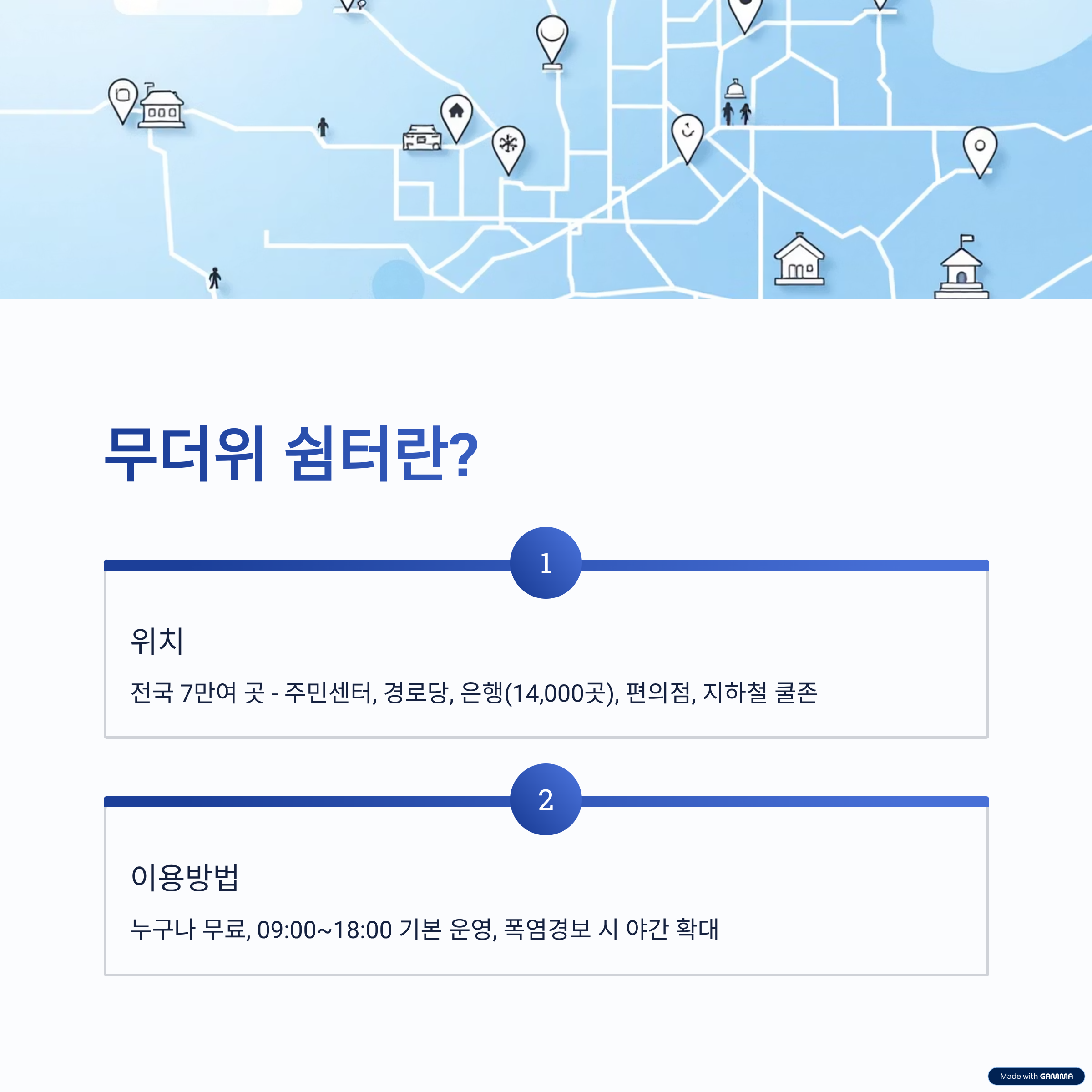 🔍 '무더위 쉼터 찾기'는 행정안전부 안전신문고 앱, 지도 앱 또는 해당 지자체 홈페이지에서 가능해요!