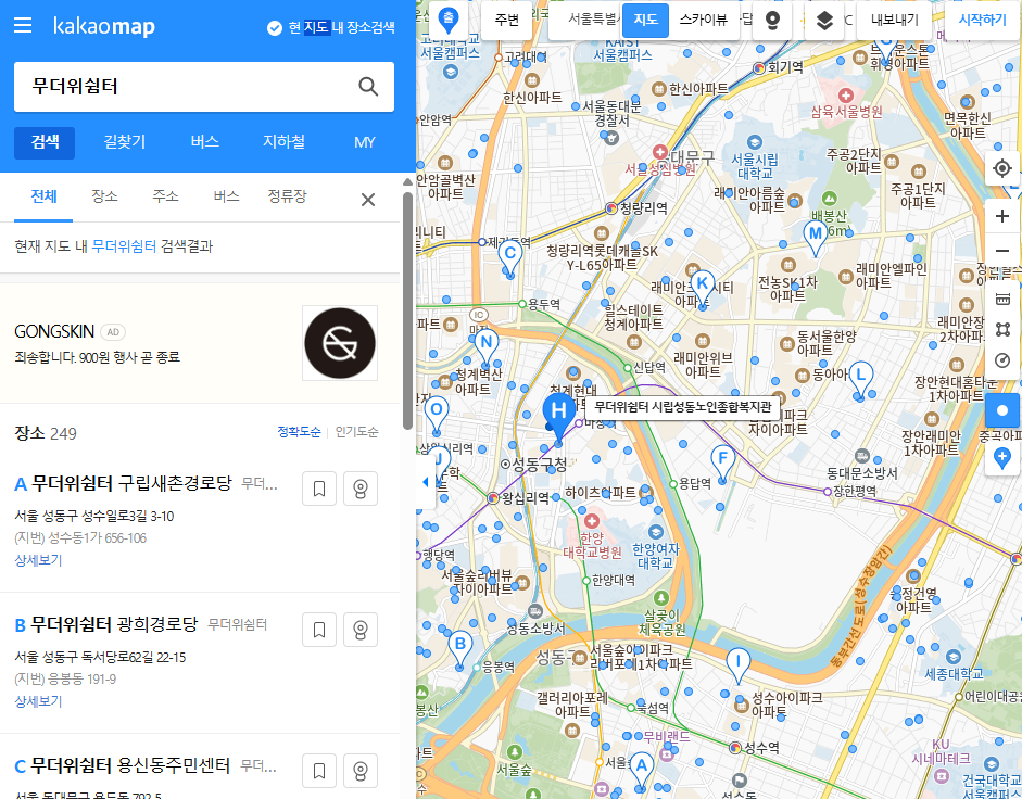 무더위 쉼터 검색화면 - 경로당, 은행, 주민센터 / 카카오맵