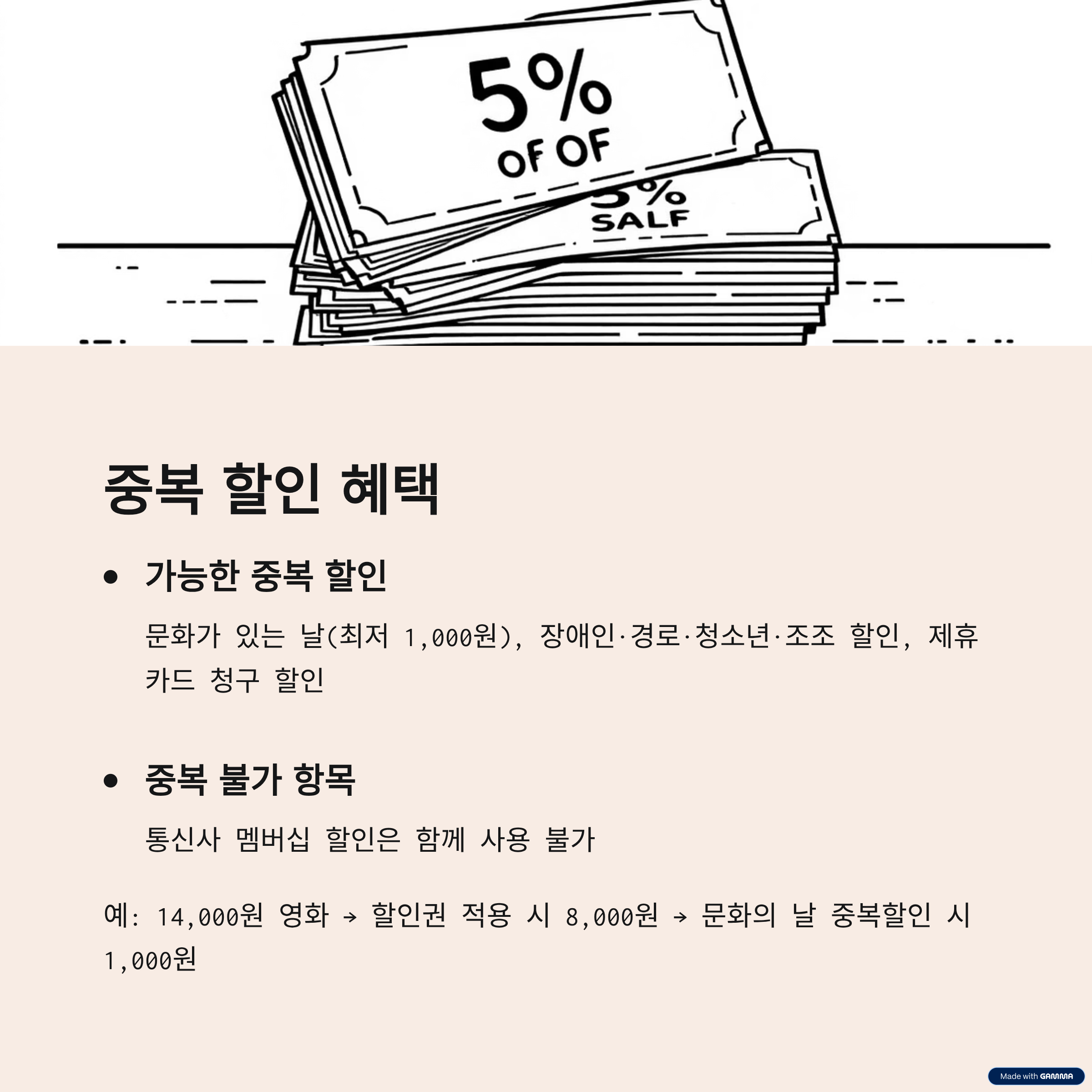 예: 정상가 14,000원 영화 → 할인권 적용 시 8,000원 → 문화의 날 중복할인 시 최종 1,000원