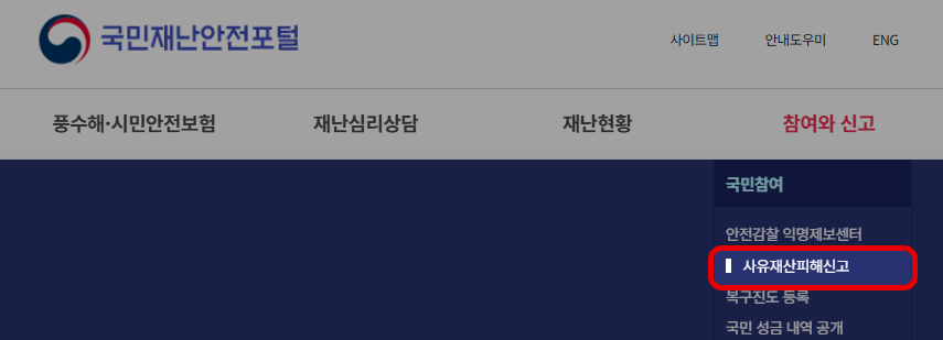 사유재산피해신고 온라인 신청 메뉴 위치 - 국민재난안전포털