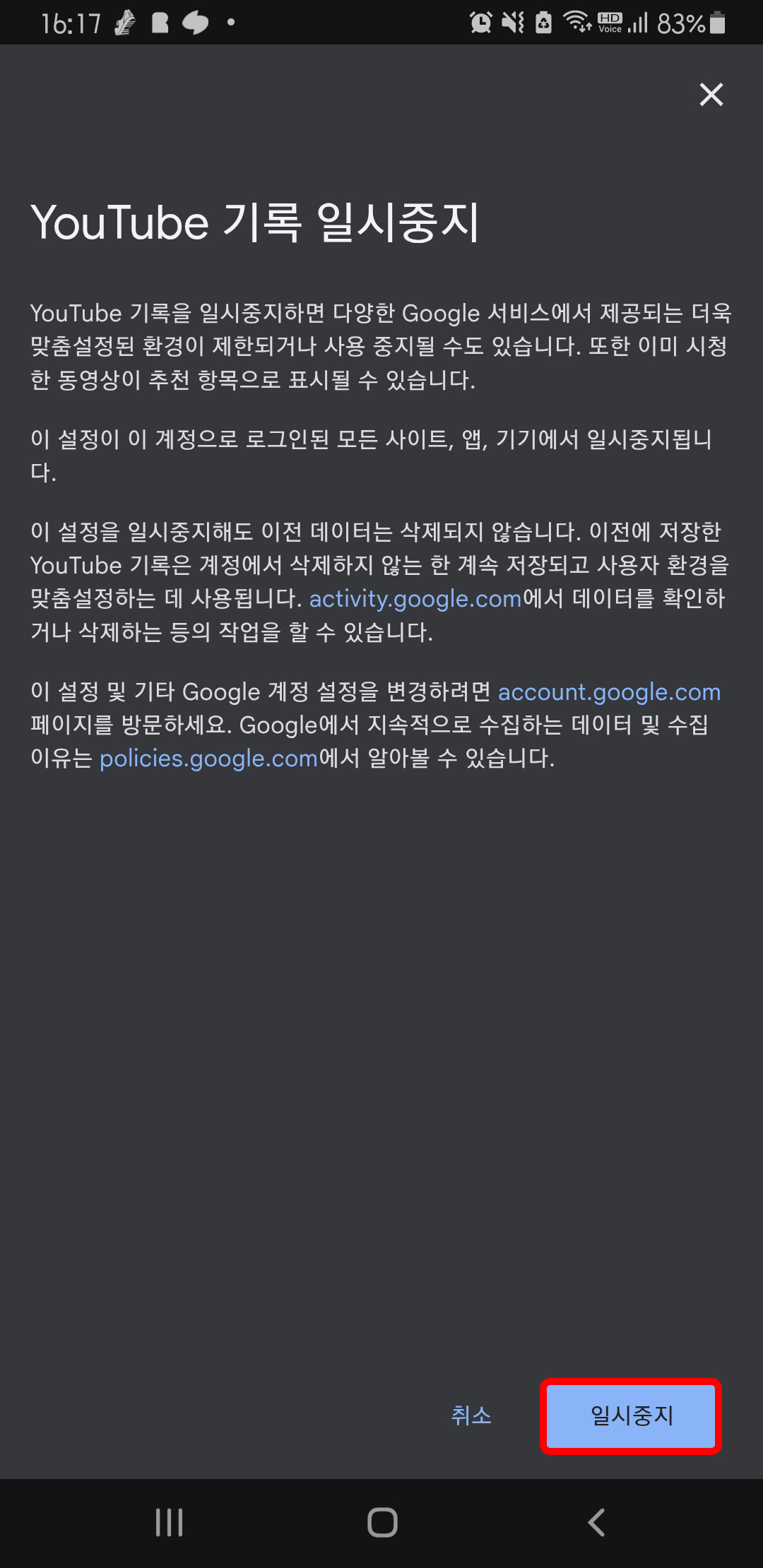 | 기록 저장 중지 | 새 기록 방지 가능 | 콘텐츠 추천이 부정확해질 수 있음 |