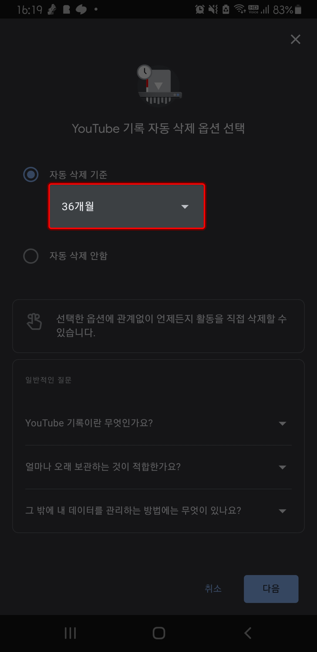 - 3개월, 18개월, 36개월 단위로 자동 삭제 설정