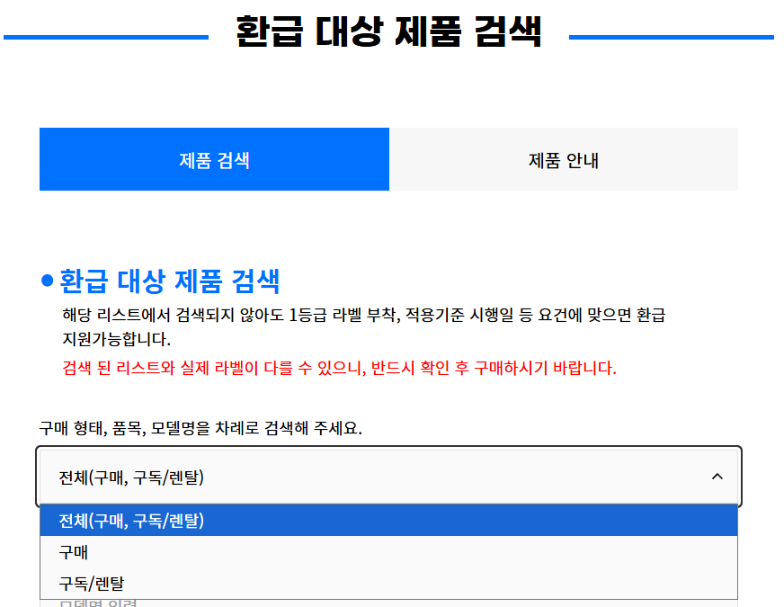 환급대상 제품 검색 - 구독/렌탈 항목 선택 가능 화면 - 으뜸효율가전제품 환급사업 홈페이지