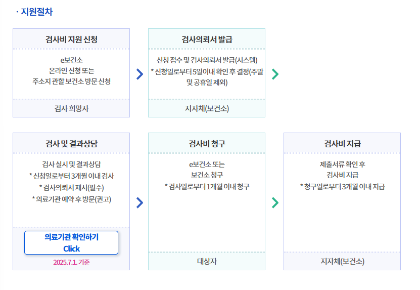 - 지정 병원만 가능하므로 e보건소 또는 보건소에서 확인