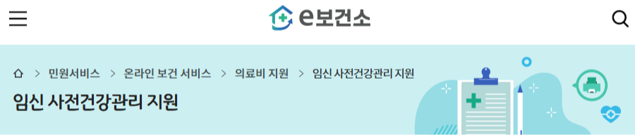 ① e보건소 접속 → 온라인 민원서비스 → 의료비 지원 → ‘임신 사전 건강 관리 지원’ 선택