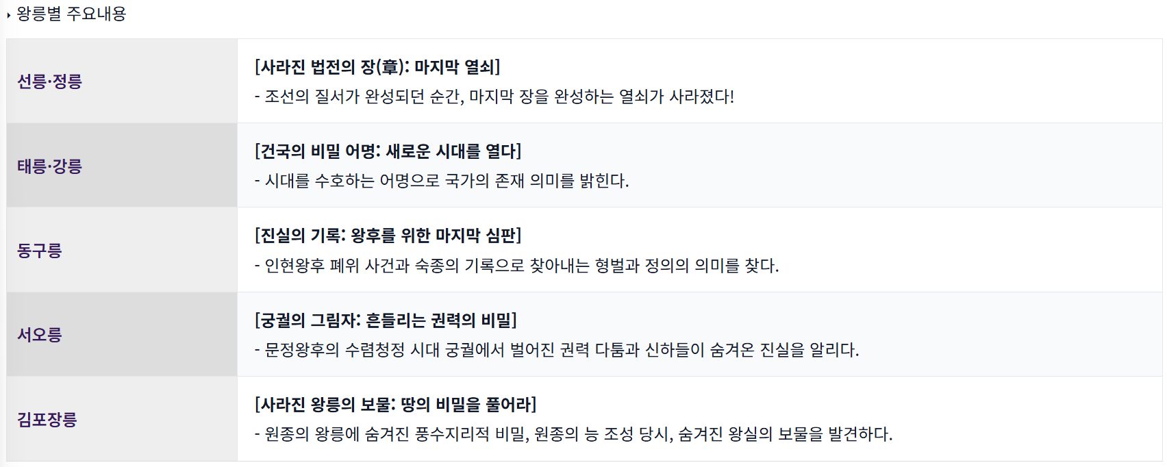 - 내용: 방문객이 ‘왕릉 수사대’가 되어 숨겨진 미션을 해결하는 탐정형 야외 방 탈출 게임. 완수 시 소정의 기념품도 받을 수 있습니다.
