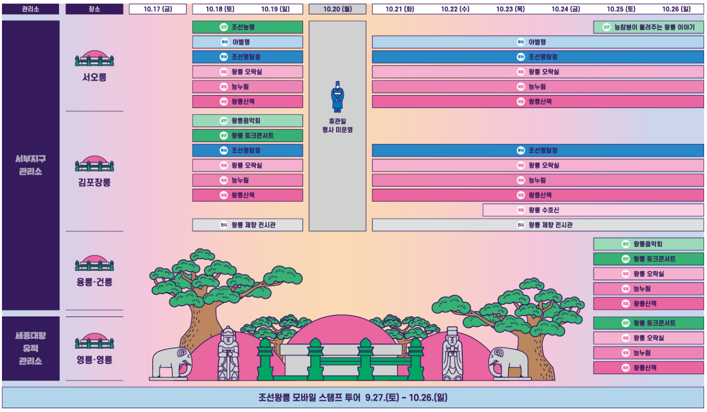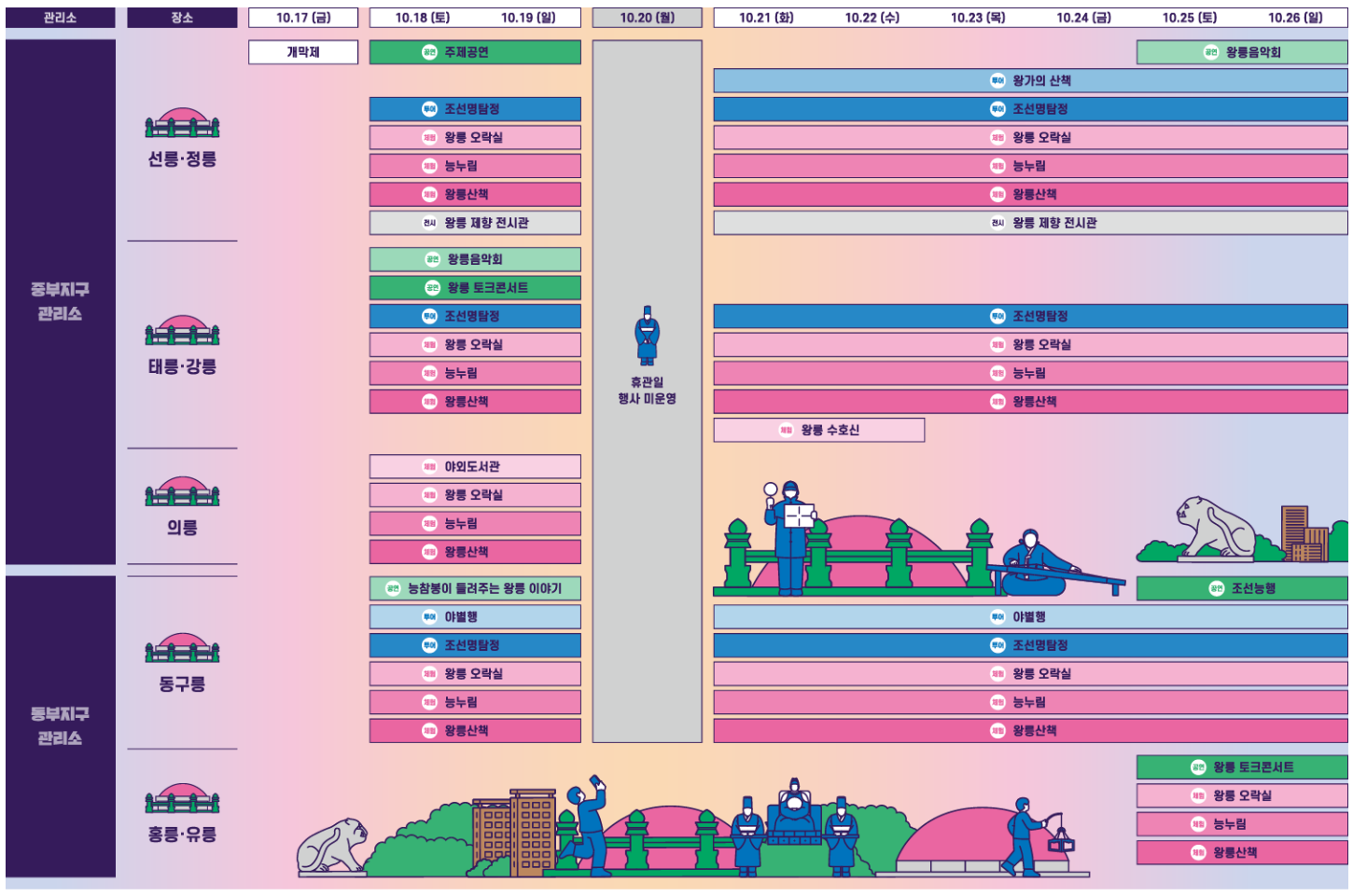 - 동구릉: 10. 25.(토)~10. 26.(일) 11:00, 15:00 / 약 60분 내외 - 장소: 동구릉, 서오릉
