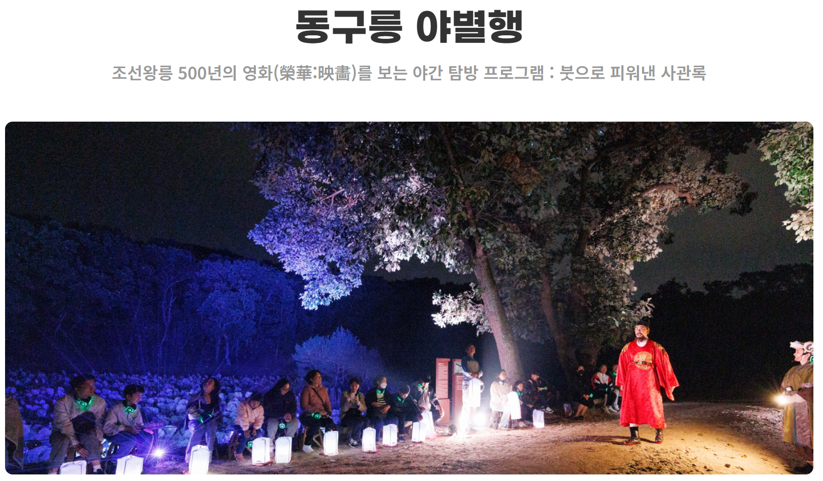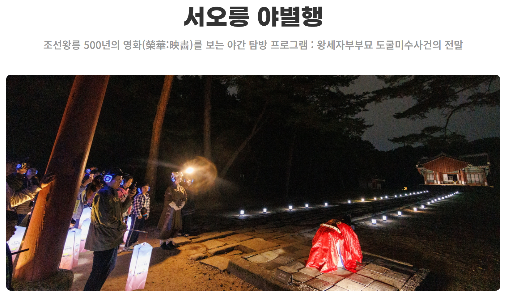 - 내용: 왕릉의 밤을 조용히 걸으며 달빛 아래의 고요한 능역을 체험하는 야간 투어.