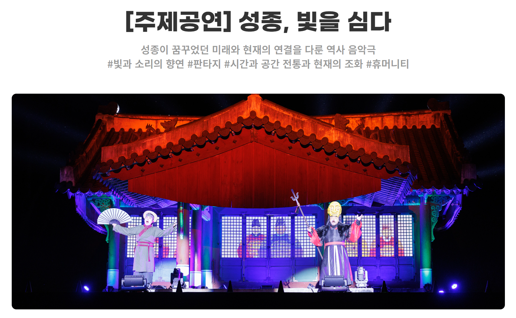 - 내용: 조선의 문화 황금기를 연 성종의 삶을 빛과 음향으로 풀어낸 미디어 음악극. 전통 정재와 현대 무대 연출이 어우러진 대표 공연입니다.