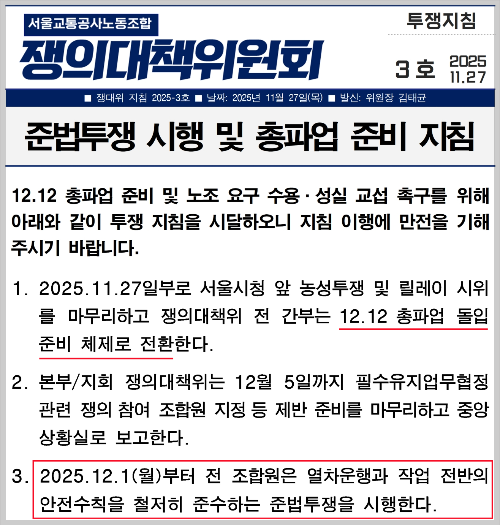 사전 예고한 대로 12월 1일부터 준법운행에 돌입했으며, 만약 요구안이 받아들여지지 않을 경우 12월 12일부터는 총파업에 들어가겠다고 예고한 상황입니다. 그리고 KTX를 운행하고 있는 철도노조는 이미 내일 오전 9시 총파업에 돌입하겠다고 예고했습니다.