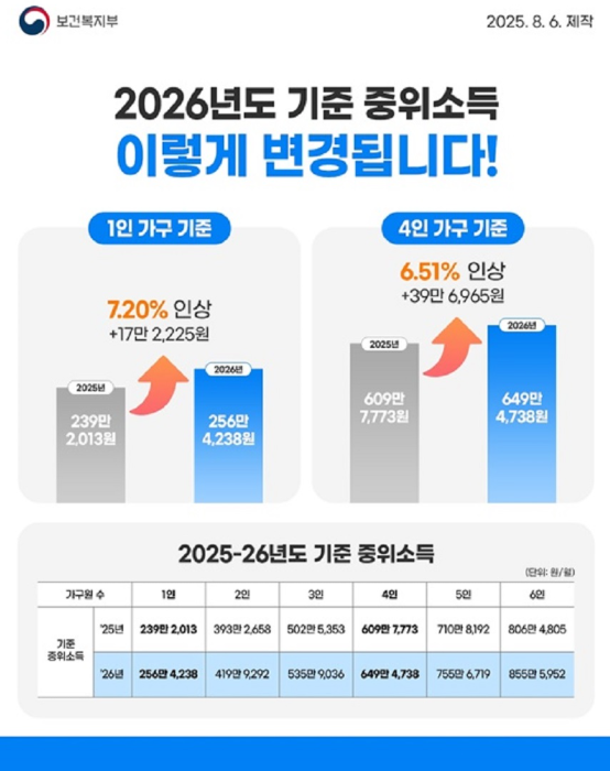 • 4인 가구: 2025년 609만 7773원 → 2026년 649만 4738원 (6.51% 인상)