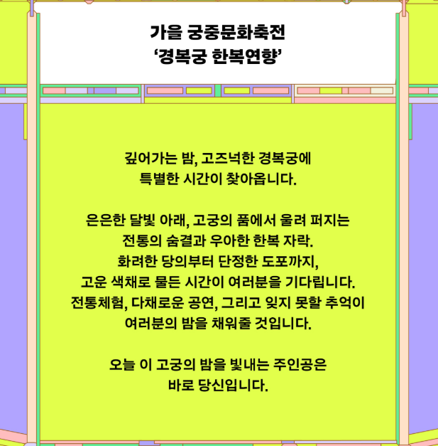올가을, 단풍 물든 고궁을 거닐며 과거와 현재가 만나는 특별한 순간을 경험해 보시길 바랍니다.