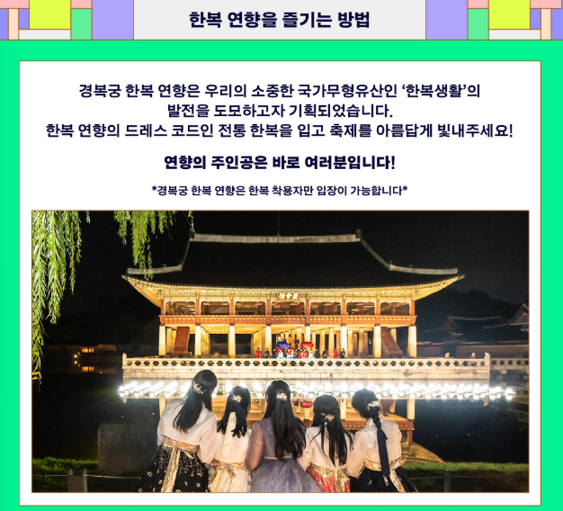 ➡ 필수는 아니지만, 한복 착용 시 무료입장 혜택이 있고 행사 참여 시 분위기를 더욱 즐길 수 있습니다.