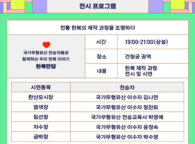 - 한복 만담: 국가무형유산 전승자들이 한복 제작 과정을 시연