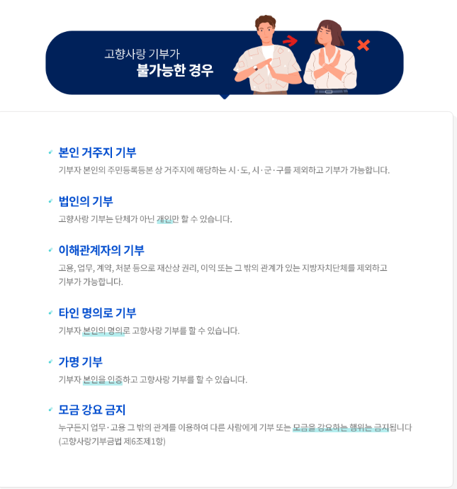 - 예: 수원시에 거주하는 사람은 수원시·경기도를 제외한 전국 지자체에 기부 가능
