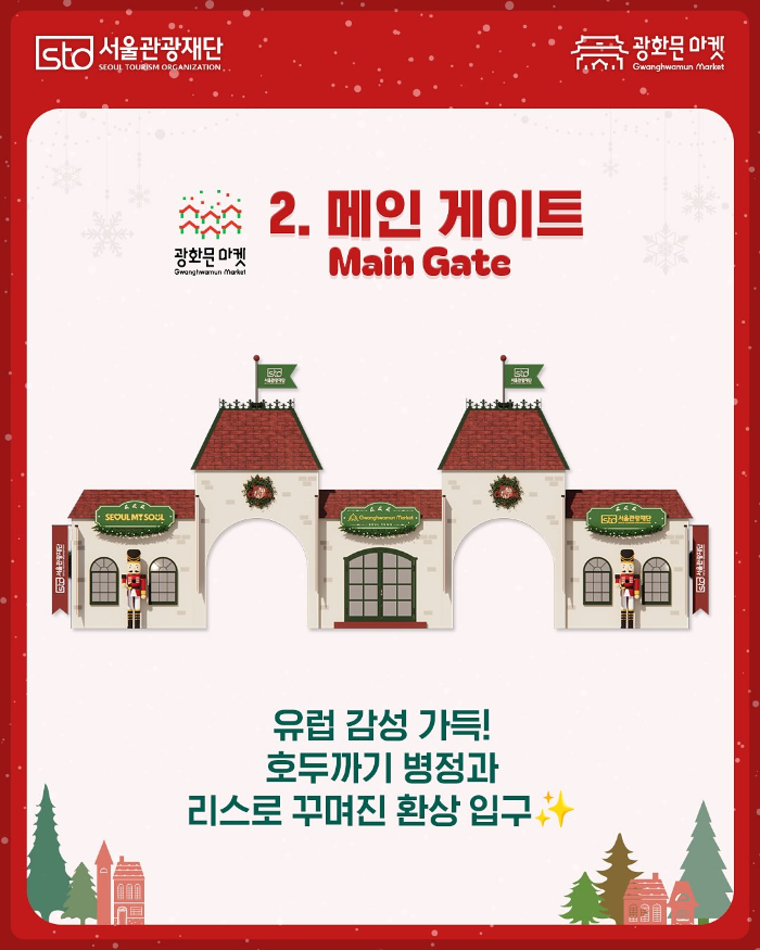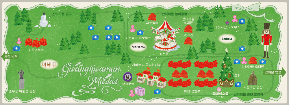 2025 광화문 마켓은 '산타마을 입구', '산타마을 놀이광장', '산타마을 마켓 빌리지' 등 3개의 공간으로 구성되어 방문객들에게 풍성한 즐길 거리를 제공합니다.