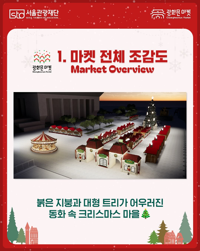 '광화문 마켓'은 서울의 중심 광화문광장에서 열리는 대규모 크리스마스 마켓입니다. 올해로 4회째를 맞이하며 서울의 대표 겨울 관광 콘텐츠로 자리 잡았으며, 소상공인 판로 지원과 야간 관광 활성화를 목표로 운영됩니다.