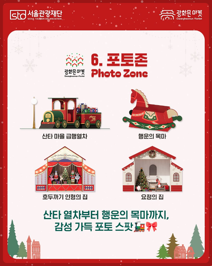 - 화려한 포토존: 광장 중심에 설치된 15m 높이의 대형 크리스마스트리와 함께 호두까기 인형의 집, 진저브레드 쿠키의 집 등 10여 개의 아기자기한 포토존이 마련되어 있어 인생 사진을 남기기에 좋습니다.