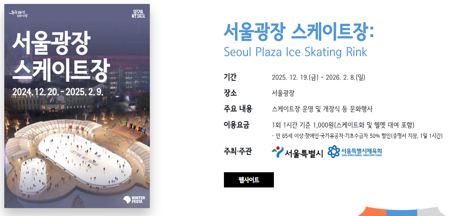 서울광장 스케이트장 (서울광장): 겨울 도심 속 낭만을 즐길 수 있는 서울광장 스케이트장이 올해도 어김없이 문을 엽니다. 저렴한 이용료로 누구나 부담 없이 스케이트를 즐길 수 있어 매년 큰 사랑을 받는 곳입니다. 올해는 12월 19일부터 내년 2월 8일까지 52일간 운영될 예정이며, 성탄절과 송년 제야 등 시기별로 다채로운 이벤트가 함께 열립니다.