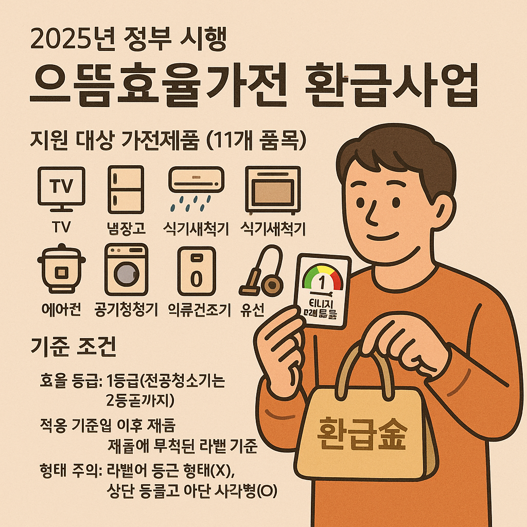 2025년 정부가 시행하는 '으뜸효율가전 환급사업'은 에너지 소비효율 1등급 제품을 구매하면 최대 30만 원까지 현금 환급을 받을 수 있는 제도입니다.