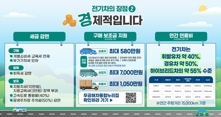 2025년에도 국고 보조금, 지자체 추가 지원, 세액공제 등 다양한 혜택이 제공되며, 실구매자 입장에서는 수백만 원의 비용 절감 효과를 누릴 수 있습니다.
