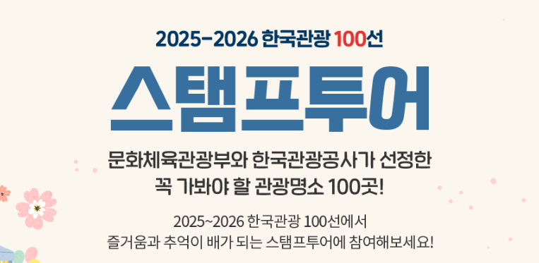 2025-2026 한국관광 100선스탬프투어 이벤트 문화체육관광부와 한국관광공사가 선정한 꼭 가봐야 할 관광명소 100곳! 2025~2026 한국관광 100선에서 즐거움과 추억이 배가 되는 스탬프투어에 참여해보